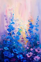 Dit schitterende kunstwerk brengt een explosie van kleuren en vormen samen, perfect voor liefhebbers van moderne abstracte kunst. Het toont een veld van levendige bloemen in diverse tinten blauw, paars en roze, die lijken te dansen in het zachte licht van een opkomende zon. Vlinders zweven tussen de bloemen, wat een gevoel van beweging…
