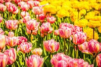Een zeer kleurrijk veld met fleurige tulpen. De zon zorgt er voor dat de kleuren extra mooi zichtbaar zijn. Een prachtige dag in een prachtige omgeving.