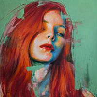 Modern portret van een vrouw die wegkijkt wat een sfeer van geheimzinnigheid, mysterie en introspectie oproept. De levendige penseelstreken en harde overgangen tussen warme en koele tinten brengen dit kleurrijke portret tot leven. Deze overgangen accentueren de emotionele gelaagdheid terwijl de contrastrijke groene achtergrond en rode haarkleur het werk energie en vitaliteit geven.