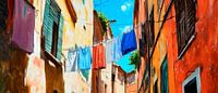 Koop dit schilderij Kleurrijk wasgoed tussen huizen - idylle van Poster Art Shop als reproductie geprint op canvas, aluminium dibond, (ingelijste) fotoprint, behang en ArtFrame. Voor jou op maat geprint in Fine-Art kwaliteit.