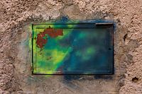 Een ijzeren muurplaat met daarop een roestplek en graffiti in felle kleuren waaronder blauw en fluoriserend geel. Het is waarschijnlijk een brievenbus. Ik heb deze gefotografeerd in Frankrijk.