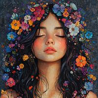 Kleurrijke Bloem Krans - Op dit vrouwen schilderij zie je een jonge vrouw met gesloten ogen, wiens hoofd omringd is door een levendige, kleurrijke krans van verschillende bloemen die het beeld domineren.