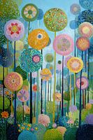 Kleurrijke Bloemen | Whimsical Blooms in Blue Sky - Dit kleurrijke schilderij toont een dromerige wereld van abstracte bloemen, met felgekleurde cirkels in diverse tinten op lange stelen, die een speelse sfeer uitstralen in een harmonieuze, moderne stijl.