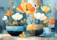 Kleurrijke Bloemen in Vaas - Op dit bloemen schilderij zie je kleurrijke bloemen in verschillende vaasjes, met opvallende oranje, gele en witte bloemen tegen een achtergrond van frisse blauwtinten en een gele vlinder die voorbij fladdert.