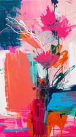 Dit schilderij nodigt de toeschouwer uit om zich te laten meeslepen door de levendige kleuren en de dynamische vormen. Het is een viering van de schoonheid van abstractie en de kracht van kleur, en het straalt een gevoel van vreugde en artistieke expressie uit. De combinatie van bloemen en abstractie maakt dit kunstwerk een visueel feest voor de zintuigen, dat uitnodigt tot reflectie en waardering van de abstracte esthetiek.