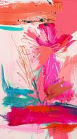 Dit kunstwerk is een levendige en dynamische abstracte schildering die de schoonheid van bloemen vastlegt in een explosie van kleur en vorm. De compositie wordt gedomineerd door felle tinten zoals roze, oranje en groen, die op een expressieve en spontane manier zijn aangebracht. De penseelstreken zijn dik en vloeiend, wat een gevoel van…
