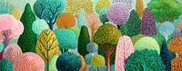 Kleurrijke Bomen | Colorful Nature Celebration - Dit kleurrijke bomen schilderij toont een levendige verzameling abstracte bomen met diverse bladeren en stammen in vrolijke kleuren zoals groen, roze en geel, die samen een speelse en frisse uitstraling creëren binnen een natuurlijk landschap.