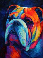 Kleurrijke Bulldog - Op dit honden schilderij zie je de krachtige kop van een bulldog, met opvallende kleuren zoals rood, blauw en geel die samen een levendige uitstraling creëren.