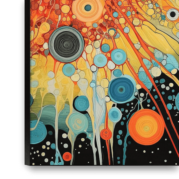 Kleurrijke Dynamiek - Dit kunstwerk brengt een speelse mix van organische mandala patronen en een levendig kleurenspectrum. Het centrale, zonachtige motief straalt in warme oranje en rode tinten, geflankeerd door een diversiteit aan cirkels in blauwe en groene schakeringen tegen een dynamische, diepzwarte achtergrond. Fijne lijntjes en…