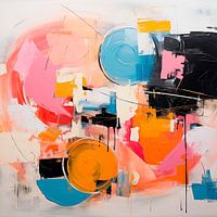 Dit kunstwerk is een levendige uitdrukking van kleurrijke emoties die samenkomen op het canvas. De stijl, die doet denken aan abstract expressionisme, speelt met vette penseelstreken en een rijke mix van kleuren om een gevoel van beweging en energie over te brengen. De prominente kleuren - blauw, oranje, roze en zwart - dansen samen in harmonie, waarbij elke tint zijn eigen verhaal vertelt. Oranje en geel symboliseren warmte en optimisme, terwijl blauw en roze rust en sereniteit uitstralen. De donkere, bijna zwarte gebieden voegen diepte en contrast toe, waardoor de lichtere kleuren nog meer opvallen. De druipende verf onderaan het kunstwerk geeft een gevoel van spontaniteit, alsof de emoties zo krachtig waren dat ze niet binnen de grenzen van het canvas konden worden gehouden. Het algehele thema van het kunstwerk is de viering van emoties, leven en de chaotische schoonheid van menselijke ervaringen.