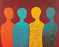 Kleurrijke Figuren | Abstracte Mensen met Stippen - Op dit abstract schilderij zie je vier mensenfiguren in felle kleuren, zoals oranje, blauw en geel, met een speelse stippenachtige textuur tegen een warme achtergrond in rood.