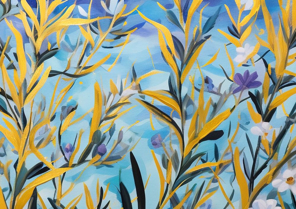 Kleurrijke Floral - Het kunstwerk toont een levendige florale scene die gedomineerd wordt door een spel van kleur en licht, waarbij langgerekte, goudgele en groene flora zich sierlijk vermengen met tere, witte en paarstintige bloesems. De gebruikte olieverftechniek accentueert de dynamische textuur en creëert een contrastrijke achtergrond die varieert van diepzeeblauw tot licht azuur, waardoor het een fris en tegelijk warm geheel vormt.