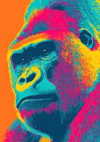 Kleurrijke Gorilla - Op dit dieren schilderij zie je een grote gorilla met opvallende felle kleuren zoals blauw, roze en oranje, die samen een modern en abstract effect creëren.