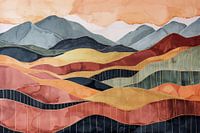 Dit werk toont een levendig landschap van golvende heuvels in diverse tinten rood, geel, groen en blauw. De vloeiende lijnen en kleurrijke lagen geven een dynamisch en toch rustgevend gevoel, alsof de natuur in beweging is onder een schemerende hemel. De contrasterende kleuren en texturen creëren een visueel spektakel dat zowel energie als kalmte uitstraalt. Dit werk zou prachtig staan in een woonkamer of kantoor, waar het een vleugje natuur en creativiteit kan brengen.