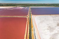 Luchtfoto van levendige zoutpannen met verschillende tinten rood en wit, met een duidelijke scheidingsweg die het landschap doorsnijdt. Het geometrische patroon van de vijvers vormt een opvallend contrast met de omringende natuurlijke omgeving.