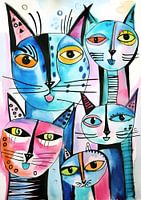 Waterverf illustratie met een familie katten in voornamelijk blauw en roze tinten.