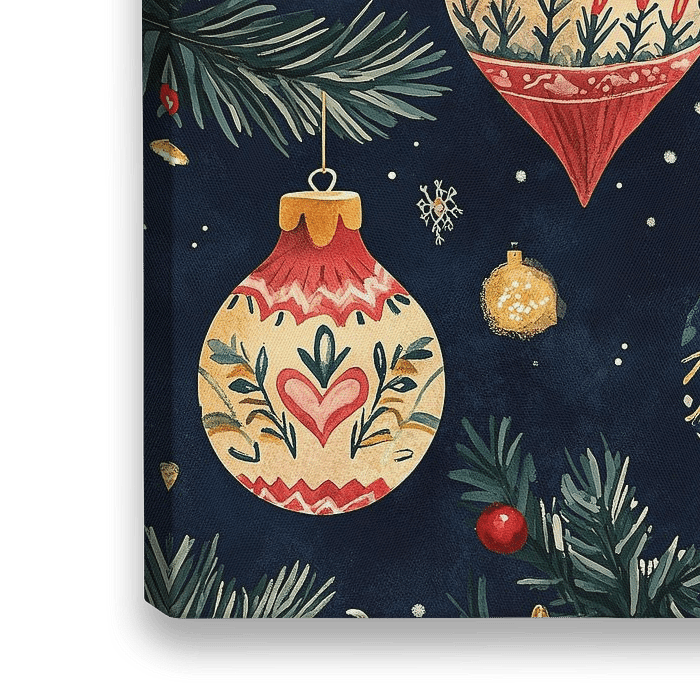 Kleurrijke Kerst Decoratie - Dit kerst schilderij toont kleurrijke kerstballen, versierd met diverse patronen, hangend tussen dennentakken met rode bessen, onder een nachtelijke sterrenhemel.