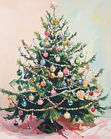 Kleurrijke Kerstboom - Dit kerstboom schilderij toont een weelderig versierde boom met kleurrijke kerstballen en slingers tegen een zachtroze achtergrond.