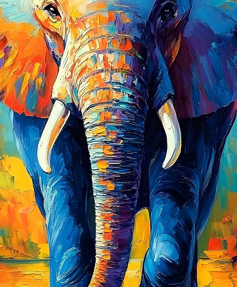 Deze levendige schildering van een olifant, harmonieus weerspiegeld in het water, viert de majestueuze schoonheid en levendige geest van deze iconische dieren.