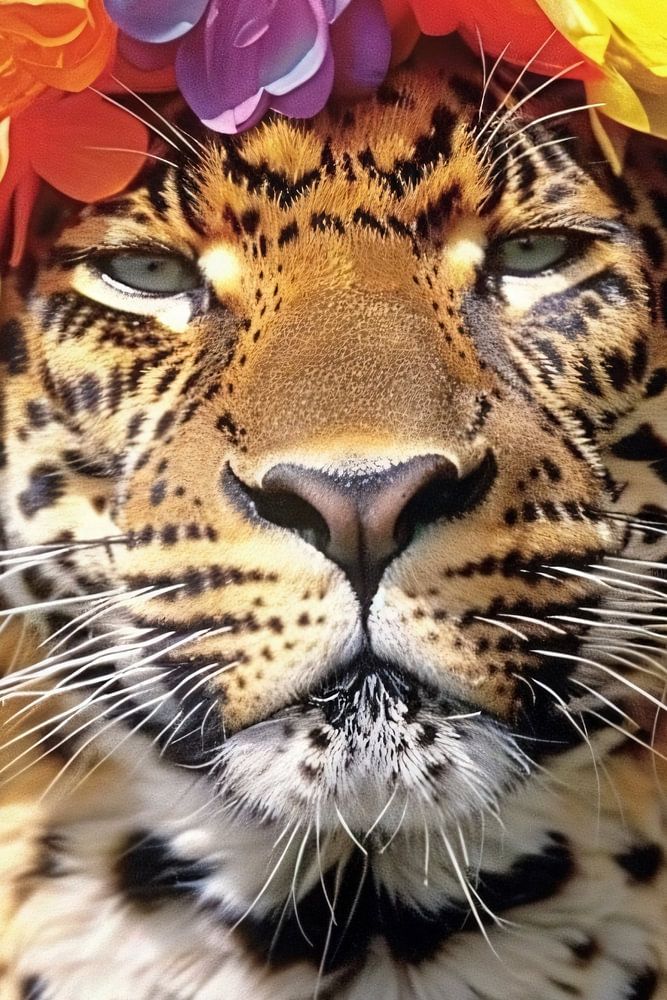 Dit prachtige en unieke ontwerp toont een majestueuze leopard met een levendige bloemenkrans op zijn kop. De gedetailleerde en realistische weergave van de leopard wordt prachtig gecombineerd met de surrealistische en kleurrijke bloemen, wat een opvallend contrast en een artistieke flair geeft. Deze afbeelding zou een fantastische aanvulling zijn op elke moderne woonruimte of kantoor, en brengt zowel een gevoel van wilde natuur als artistieke creativiteit in elke kamer. Perfect voor liefhebbers van dieren, kunst en kleur. Dit ontwerp vangt de schoonheid en de kracht van de natuur op een onverwachte en visueel verbluffende manier.