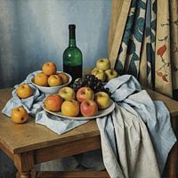Een rijk gedekte tafel met een overvloed aan fruit, waaronder appels, sinaasappels en druiven, omlijst door zachte stoffen en een fles wijn. Deze compositie roept een gevoel van overvloed en gastvrijheid op, ideaal voor een gezellig samenzijn.