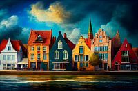 Dit digitale schilderij toont een kleurrijke straat in een middeleeuws stadje, waar de zon fel schijnt en de lucht strakblauw is. De gevels van de huizen zijn beschilderd in heldere tinten geïnspireerd op de caribische cultuur, met paarse, roze, oranje, gele en turkooizen kleuren die contrasteren met elkaar en met de witte kozijnen en deuren.