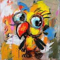 Een vrolijk portret van een papegaai met grote ogen en een levendige uitstraling. De felle kleuren en expressieve verfstreken geven dit werk een speels en tropisch karakter. Een echte blikvanger die direct energie en gezelligheid brengt in elke ruimte.