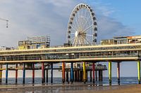 Op de achtergrond staat het reuzenrad, een populaire attractie die een prachtig panoramisch uitzicht biedt over de stad en de zee. Het contrast tussen de helderblauwe lucht, het reuzenrad en de kleurrijke pilaren van de pier creëert een levendig en uitnodigend beeld, perfect voor iedereen die de dynamische sfeer van Scheveningen wil vastleggen.