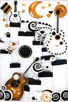 Dompel jezelf onder in een wereld van muzikale magie met dit betoverende kunstwerk! Een levendige gitaar, versierd met speelse stippen, neemt het voortouw, omringd door een scala aan grillige vormen en symbolen. De maan schijnt helder boven dit harmonieuze ensemble, terwijl sterren fonkelen met speelse energie. Laat je meevoeren door de…