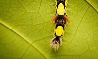 Dit prachtige macrobeeld toont een deel van een rups met schitterende vormen en kleuren, zittend op een groen blad. De gedetailleerde texturen en levendige kleuren benadrukken de delicate schoonheid van de rups en zijn omgeving. De foto nodigt de kijker uit om de wonderen van de natuur van dichtbij te bewonderen en de complexiteit van dit kleine wezen te waarderen. Perfect voor liefhebbers van macrofotografie en natuurkunst.