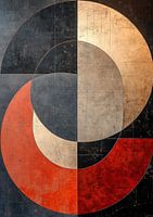 Kleurrijke Segmenten - Dit abstracte schilderij bestaat uit vier overlappende cirkelsegmenten in de kleuren donkerblauw, roestoranje, lichtbruin en gebroken wit, wat een rustige, maar krachtige visuele harmonie creëert.