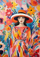 Kleurrijke Sereniteit | Bloemen Portret Kunst - Dit levendige portret valt op door het gebruik van heldere en vrolijke kleuren, met een vrouw centraal die omringd wordt door een explosie van bloemmotieven. De stijl is een hedendaagse interpretatie van een floraal tafereel, met een vleugje abstractie in de manier waarop de achtergrond en bloemen zijn weergegeven. Het kleurgebruik is divers, met dominante primaire tinten, en de blik van de vrouw voegt een zekere sereniteit toe aan de compositie.