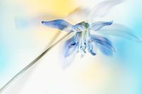 Creatieve uitwerking door dubbele belichting van een blauwe sterhyacint (Scilla) met een kleurrijke geel turquoise achtergrond.