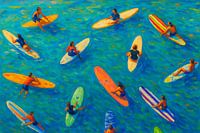 Vanuit vogelperspectief zie je een levendig schouwspel van surfers die drijven op felgekleurde boards in een glinsterende zee. Deze dynamische compositie ademt zomer, beweging en vrijheid, en is een ode aan het strandleven.