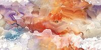 Het lijkt op een abstracte interpretatie van een natuurlijk spektakel, zoals de zachte gloed van de dageraad of de delicate overgangen van seizoenen, gevangen in een moment van tijdloze schoonheid. Verschillende tinten van oranje en rood vermengen zich met zachte paars- en blauwtinten, waardoor er een warm-koud contrast ontstaat dat de zintuigen prikkelt. De kleuren lijken te dansen en te vibreren op het canvas, wat een dynamisch en toch harmonisch geheel creëert. De subtiele textuurvariaties suggereren een gevoel van diepte en beweging, als golven die zachtjes tegen de kustlijn aanspoelen. Spatten van wit en stippen van kleur accentueren de compositie, waardoor het gevoel van spontaniteit en levendigheid wordt versterkt. Dit kunstwerk nodigt uit tot contemplatie; het lijkt bijna te leven en verandert met het licht dat erop valt.