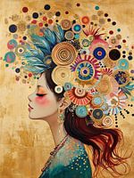 Kleurrijke Tooien - Dit vrouwen schilderij toont een portret van een vrolijke vrouw met een kleurrijke en versierde tooi van cirkelvormige patronen en veren in haar haren tegen een gouden achtergrond.