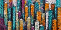 Ontdek de levendige dynamiek van "Kleurrijke Torens", een expressieve verbeelding van een stedelijke skyline. De abstracte vormen van de gebouwen lijken bijna tot leven te komen door de gedurfde kleurencombinaties van turquoise, oranje en diep paars. De textuur van de penseelstreken voegt een extra dimensie toe, waardoor elk gebouw lijkt te vibreren met energie en kleur.