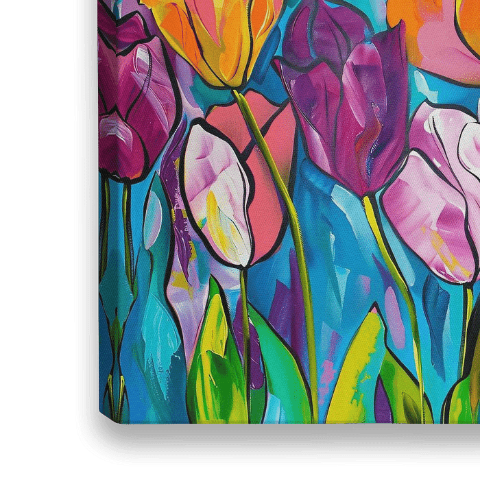 Abstract mixed media schilderij met kleurrijke tulpen op grof papier.