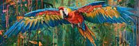 Dit werk toont een levendige papegaai in volle vlucht, omringd door een explosie van kleuren. De felblauwe en rode veren steken prachtig af tegen de groene achtergrond van de jungle. De dynamische penseelstreken en spatten geven het werk een energieke uitstraling. Dit werk brengt een vleugje exotische natuur in elke ruimte en is een perfecte keuze voor liefhebbers van tropische thema's.