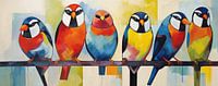 Kleurrijke Vogelkunst | Kleurrijke Vogels - Dit stuk brengt direct een gevoel van vrolijkheid in elke ruimte, met zijn verzameling van expressieve, kleurrijk afgebeelde vogels die in een rij op een tak zitten. De schilderstijl is speels en modern, waarbij de heldere primaire kleuren rood, blauw en geel de scène domineren en een krachtig…