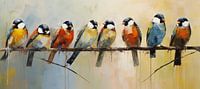 Kleurrijke Vogelkunst - Op dit schilderij poseren acht pluizige, kleurrijke vogels sereen op een tak, vastgelegd met losse, expressieve penseelstreken die de levendigheid van de scène accentueren. De achtergrond is een subtiele mengeling van warme en neutrale tinten, waardoor de felgekleurde veren van de vogels – oranje, blauw en geel –…