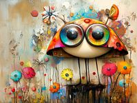 Dit schilderij toont een fantasievolle en bizarre creatie die zowel grappig als betoverend is. In het midden staat een wezentje dat lijkt op een kruising tussen een insect en een paddenstoel. Het heeft een grote, ronde paddenstoelachtige hoed die bedekt is met levendige kleuren, van oranje en rood tot geel en roze. De ogen van het wezen zijn enorm, bijna uitpuilend, en lijken op hypnotiserende spiralen die een regenboog van kleuren bevatten. Dit geeft het een expressie van verwondering of verbazing.
