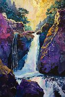 Dit prachtige schilderij toont een adembenemende waterval omringd door kleurrijke rotsen en weelderige bomen. De levendige kleuren en surrealistische stijl creëren een dromerige sfeer die je direct meeneemt naar een magische plek in de natuur. Perfect voor in de woonkamer of slaapkamer om een vleugje fantasie en natuur in je huis te brengen. De verfijnde details en het dynamische kleurgebruik maken dit kunstwerk een echte blikvanger. Het is ideaal voor liefhebbers van moderne kunst en surrealistische landschappen. Voeg dit unieke stuk toe aan je interieur en laat je dagelijks inspireren door zijn schoonheid.