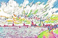 Deze molens staan langs de Zaan in Zaandam. door er een impressie van te maken onstaat een nieuw vrolijk beeld dat menig huishouden zal doen op vleuren. De Hollandse luchten het toeristme , het water en de molens maken het een modern klasiek werk. houd jij van kleur en van Holland dan is dit voor jou een goede keuze voor op de muur.