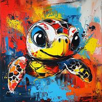 Een vrolijk portret van een zeeschildpad met grote ogen en een vriendelijke uitstraling. De expressieve verfstreken en felle kleuren geven dit werk een speels en levendig karakter. Een echte blikvanger die meteen een tropische en vrolijke sfeer brengt in elke ruimte.