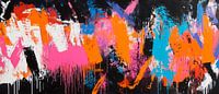 Een vuurwerk van kleuren ontvouwt zich op een diepzwart canvas en creëert een explosieve dynamiek. De felle accenten van roze, oranje en blauw geven elke kamer energie. Dit kunstwerk is ideaal voor een moderne woonkamer, waar het bezoekers boeit en levendige gesprekken stimuleert.