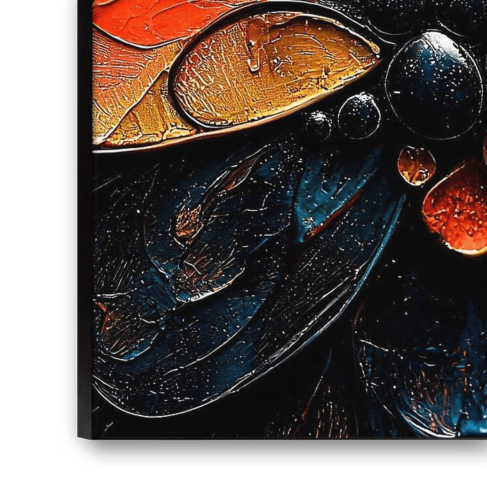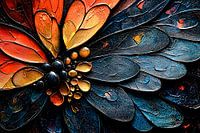 Deze prachtige wanddecoratie combineert levendige kleuren met een verfijnd abstract design. De bloembladen in rijke tinten rood, oranje en geel contrasteren prachtig met de donkere achtergrond. Subtiele details, zoals de druppelachtige elementen, voegen een dynamisch en levendig karakter toe aan het ontwerp. Perfect om elke ruimte op te fleuren, van een moderne woonkamer tot een serene slaapkamer of eetkamer. Laat uw interieur stralen met deze unieke decoratieve kunst.