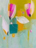 Kleurrijke abstracte bloemen in pastelkleuren. Een vrolijke blikvanger voor je interieur! Kies zelf het formaat en materiaal bij dit werk.