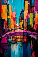 Dit opvallende kunstwerk brengt een levendige stadsscène tot leven met een explosie van kleuren en expressieve penseelstreken. De brug, centraal in het ontwerp, lijkt de verbinding te vormen tussen moderne architectuur en een creatieve fantasiewereld. De felle kleuren zoals roze, geel en blauw zorgen voor dynamiek en energie, perfect om een ruimte een moderne en inspirerende uitstraling te geven. Ideaal voor liefhebbers van stedelijke kunst en abstracte stijlen, dit ontwerp brengt niet alleen kleur, maar ook een gevoel van beweging en diepte in elke kamer. Hang het in je woonkamer, slaapkamer of kantoor en laat het de ruimte transformeren met zijn unieke charme.