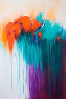 Levendige kleuren dansen op het doek en creëren een harmonieus samenspel van oranje en turquoise, terwijl zachte druppels overgaan in diep paars. Deze dynamische compositie brengt frisheid en energie in elke woonkamer en geeft de ruimte een moderne, creatieve touch. Een perfect statement voor smaakvolle kamers!
